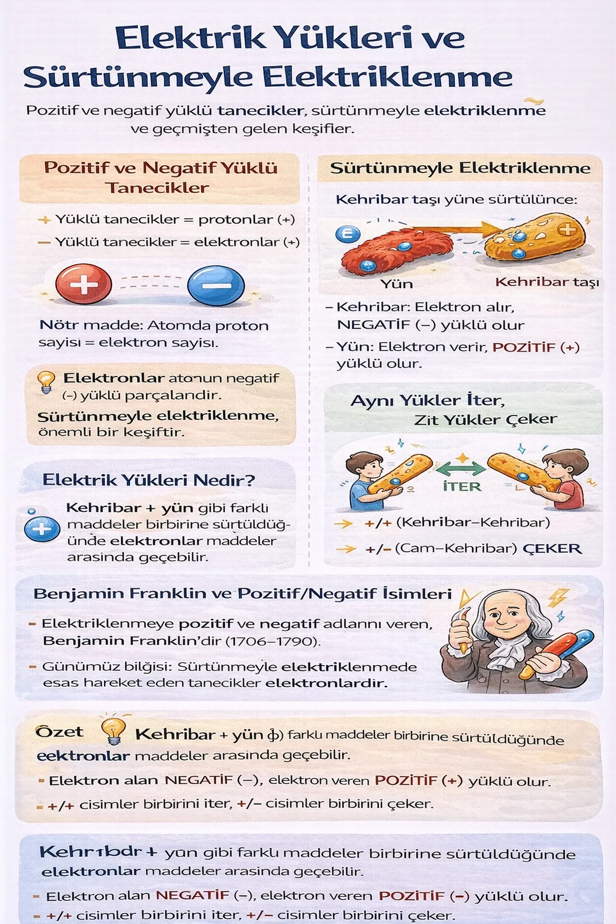 Burada önemli nokta: Sürtünmeyle elektriklenmede atomlar “yok olmaz”, kimyasal yapı genelde değişmez; sadece elektronların yer değiştirmesi söz konusudur.