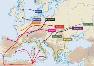 Buralara Hunların yerleşmesiyle bölgede daha fazla tutunamayan ve çoğunluğunu Germen olan Vizigotlar, Ostrogotlar, Gepitler, Burguntlar, Vandallar ve Germen olmayan Slavlar batıya doğru göç etmeye başladı. Romalılar tarafından barbar olarak görülen bu kavimler karşılarına çıkan diğer kavimleri de önlerine katarak İspanya’ya hatta Kuzey Afrika’ya kadar ilerlediler. Avrupa’da yıllarca süren ve günümüz Avrupa Devletlerinin temellerinin atıldığı bu döneme Kavimler Göçü denir.