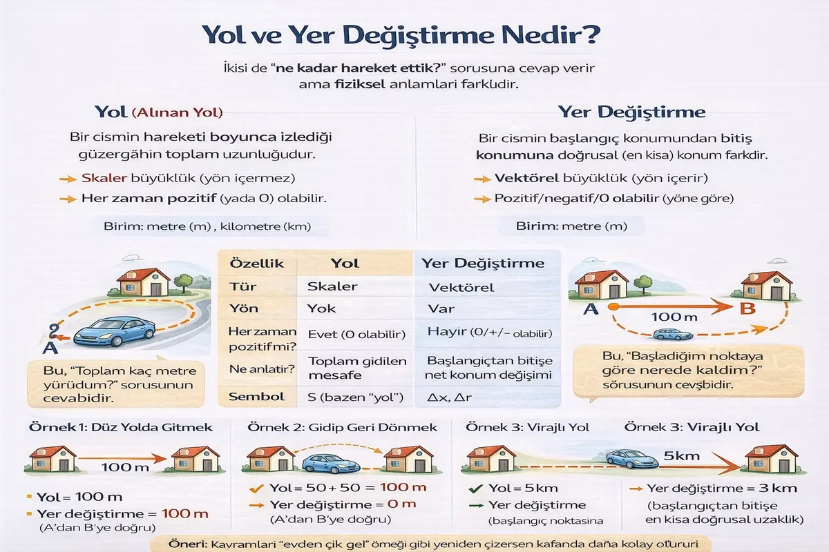 Hareket konularında en çok karıştırılan kavramlardan ikisi yol ve yer değiştirmedir. İkisi de “ne kadar hareket ettik?” gibi görünse de, fiziksel anlamları farklıdır.